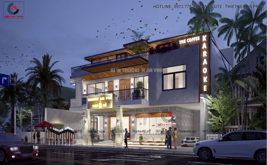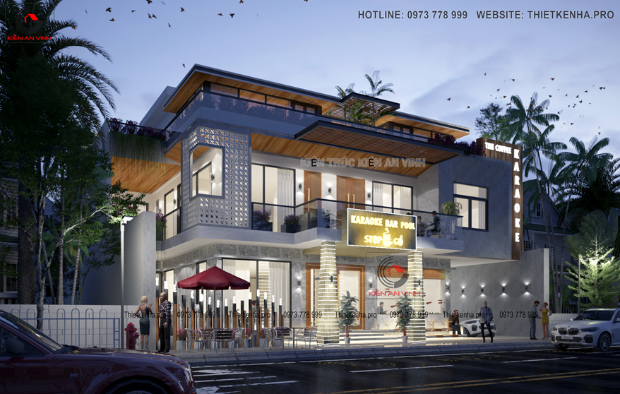 Nét đẹp hiện đại của một quán cafe sẽ thích hợp cho mọi đối tượng khách hàng. Đồng thời để sự thư giản trở nên đa dạng hơn, kiến trúc sư đã kết hợp kiến trúc thiết kế quán cafe đẹp với karaoke. Được thực hiện theo như yêu cầu của gia chủ về hình khối kiến trúc cũng như công năng sử dụng của khối hình này. Kiến trúc sư đã phân chia đồng đều khu vực cafe và karaoke vô cùng cân xứng. Điều này đã được kiến trúc sư tính toán kỹ lưỡng, sao cho diện tích 2 khu vực được hài hòa nhất có thể.