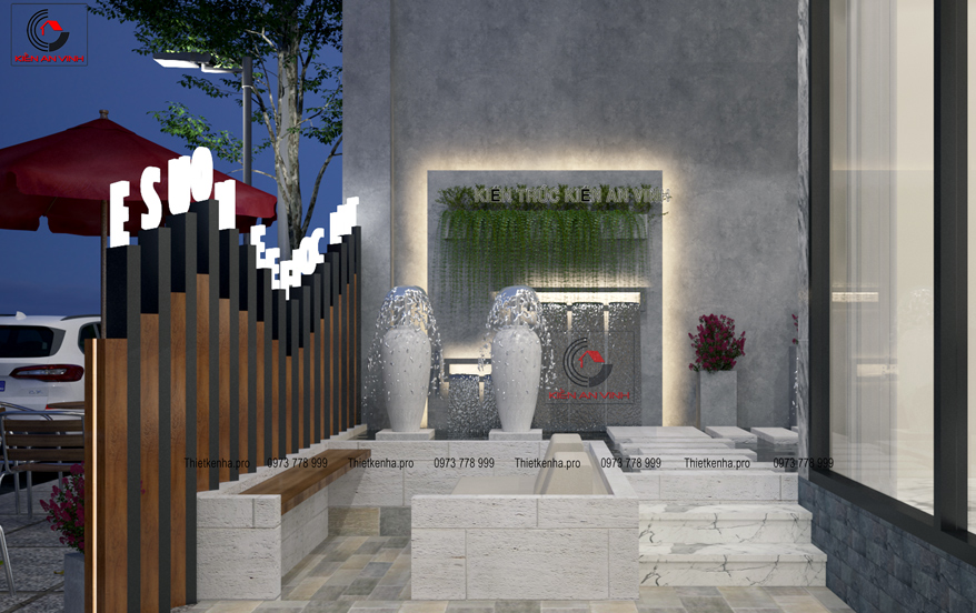 Dù xem ở mọi góc nhìn hay vào ban ngày hoặc đêm, kiến trúc quán cafe luôn mang lại vẻ đẹp nổi bật. Ở phần mặt tiền tầng trệt, các thanh gỗ cao thấp. Tạo nên nét đẹp ấn tượng độc đáo so với các mẫu quán cafe thông thường. Đồng thời ngay phần cổng chào còn được kiến trúc sư bố trí các bình đá. Với thác nước luân chuyển liên tục. Vừa tạo sự mát mẻ cho không gian này đồng thời còn giúp tạo nét đặt trưng cho quán.