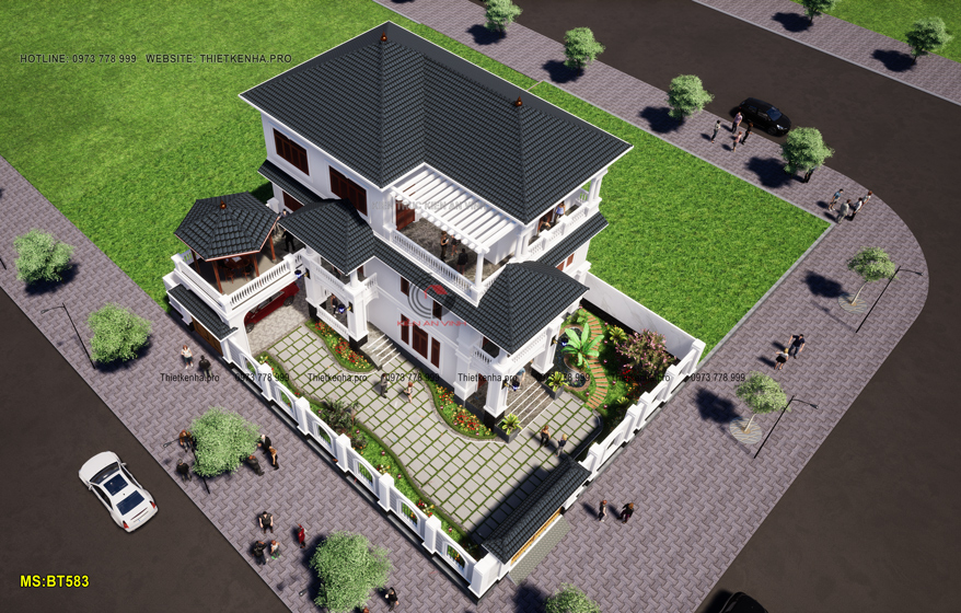 Để tăng thêm nét đẹp sinh động cho bản vẽ mẫu biệt thự 3 tầng hiện đại 2 mặt tiền này. Kiến trúc sư chọn phối hợp kiến trúc với sân vườn. Được bố trí các ô trống để đặt những chậu tiểu cảnh đa dạng màu sắc. Mang đến sự tươi mới cho không gian và kiến trúc. Ngay từ đầu kiến trúc sư đã đặt kiến trúc ở một góc đất, phần đất trống còn lại tận dụng là vườn. Giúp chủ nhà có thêm khu vực để thư giản.