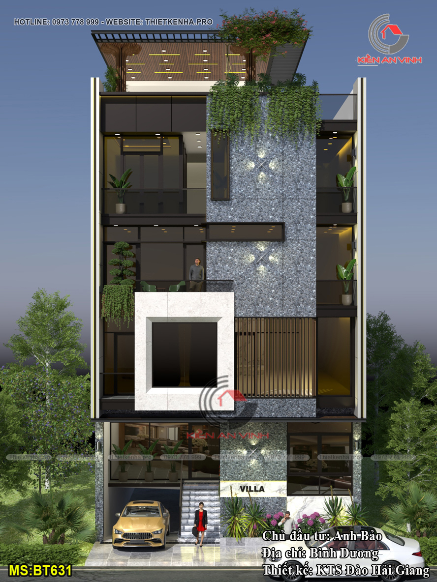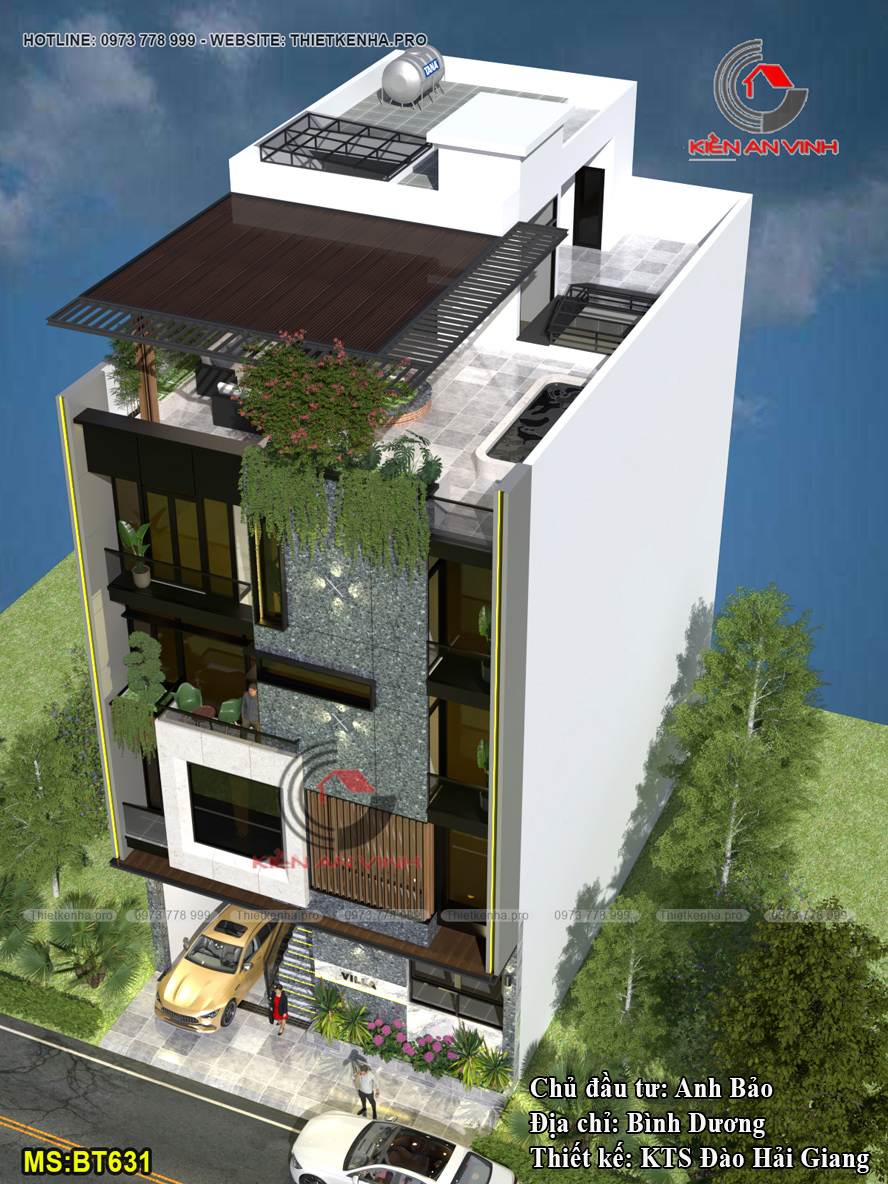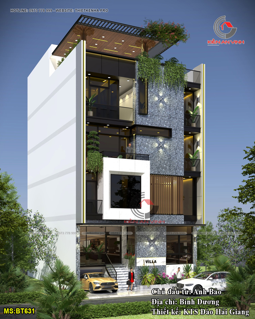 Mẫu biệt thự 4 tầng hiện đại BT631 là lựa chọn lý tưởng cho gia đình có diện tích đất 10x15m. Thiết kế tối ưu chi phí mà vẫn đảm bảo tính thẩm mỹ và công năng. Công trình ngoài mang nét đẹp thời thượng với đường nét vuông vức. Khi kết hợp vật liệu hiện đại giúp tổng thể trở nên sang trọng và không lỗi theo thời gian.