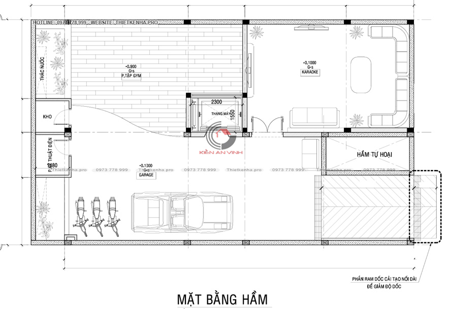 Thiết kế tầng hầm rộng rãi, có thể để ô tô và nhiều xe máy. Việc bố trí gara dưới hầm vừa tiết kiệm diện tích. Cạnh đó còn vừa đảm bảo tính riêng tư và an toàn cho phương tiện. Qua sát bản vẽ có thể thấy, tầng hầm ngoài có công năng đậu đỗ xe, còn kết hợp thêm khu vực gym và karraoke. Tiết kiệm tối đa diện tích dùng.