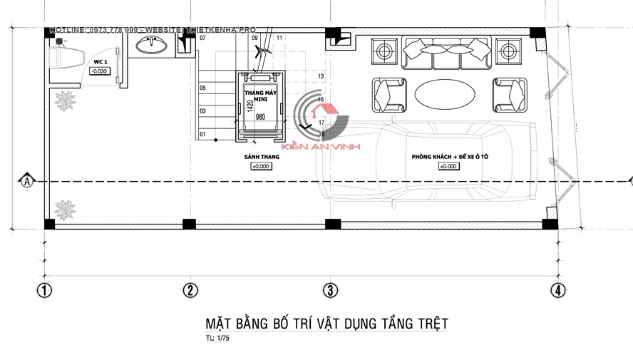 Tầng trệt: Gồm phòng khách, khu vực để oto, 1 wc và khu vực thang máy + thang bộ.