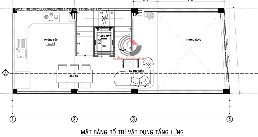 Tầng lửng: Bố trí khu vực bếp, khu bàn ăn và khu vực thư giản.