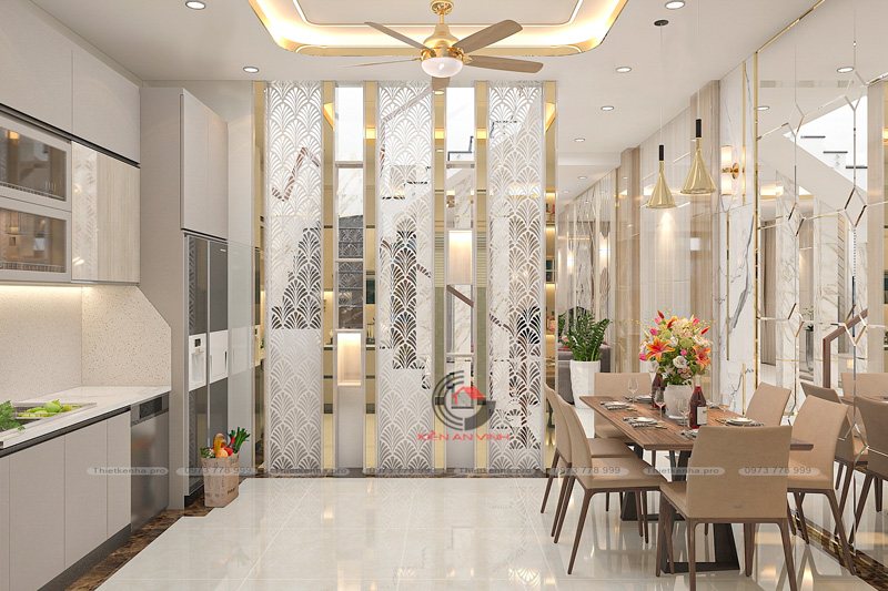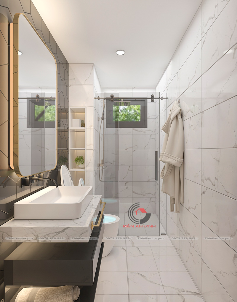 Các kiến trúc sư Kiến An Vinh đã giảm bớt số lượng lớn và thay vào đó sử dụng nhiều màu sắc và hình dạng góc cạnh. Ngoài ra, chúng tôi chú trọng sử dụng một số vật liệu kính để lấy ánh sáng tự nhiên. Làm cho căn nhà phố 3 tầng trông rộng rãi hơn.