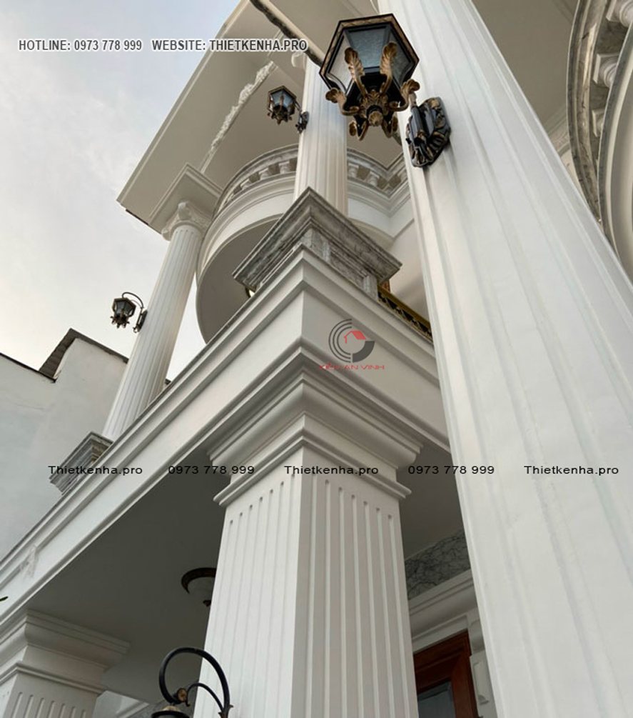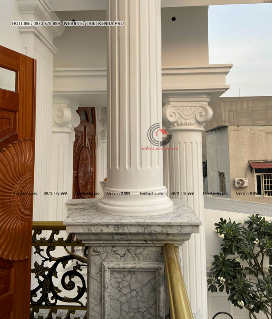 Trụ chống được đặt ở vị trí mặt chính ở 2 khối kiến trúc. Vừa mang lại nét đẹp cân đối, vừa đem lại sự chắc chắn và giảm thiểu trọng lực đè của mái. Hoa văn cũng được đặt ở đầu và chân cột. Tạo nên một khu vực sảnh mang nét đẹp nhẹ nhàng nhưng vô cùng tinh tế.