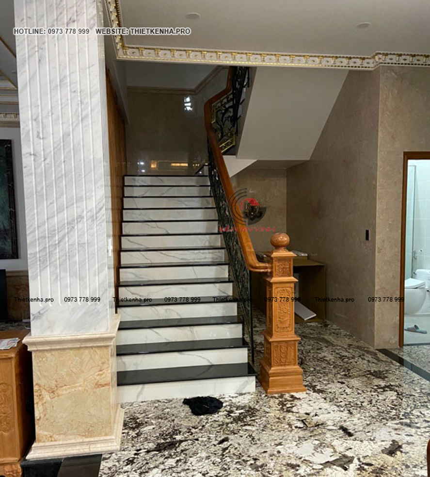 Phủ tone trắng cho toàn bộ kiến trúc, nhưng để việc xây dựng biệt thự 3 tầng này thêm sinh động. Kiến trúc sư sử dụng loại đá ốp tường mang gam màu sẫm nhẹ với các đường vân trên đá. Càng khiến cho mặt tiền kiến trúc trở nên thêm sang trọng và đa màu hơn. Để đến được sảnh phải đi qua khu vực các bậc thang, với thiết kế loe rộng làm điểm nhấn cho không gian thêm đồ sộ.