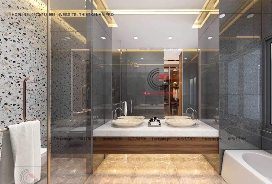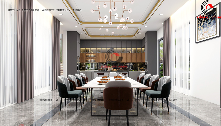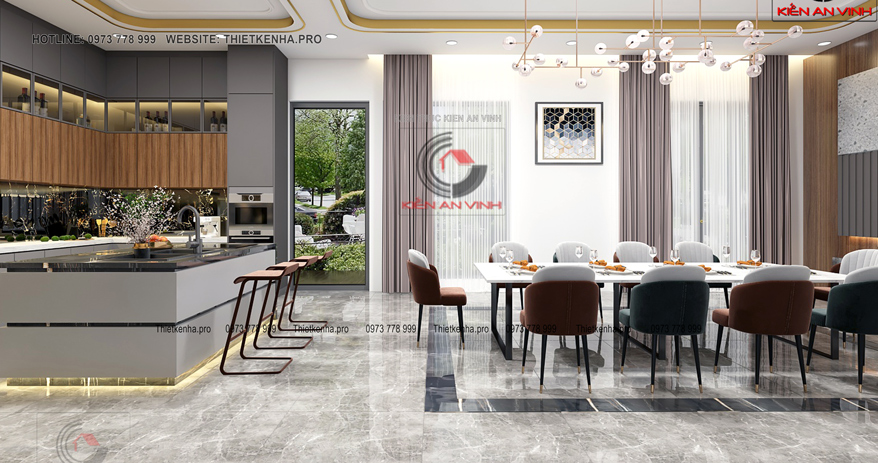 Khu vực bếp được thiết kế rộng rãi giúp các thành viên dễ dàng hơn trong việc sử dụng và di chuyển. Các vật dụng được thiết kế và chọn vật liệu cao cấp với độ bền cao. Thiết kế này vừa phù hợp với kiến trúc vừa mang lại hiệu quả thẩm mỹ cao cho tổng thể không gian bên trong biệt thự.