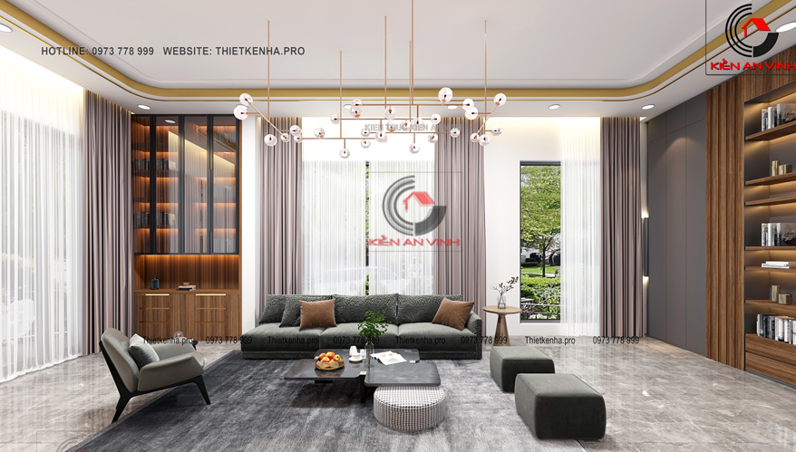 Hình ảnh nội thất được thiết kế dựa theo kiến trúc hiện đại bên ngoài. Nội thất mang thiết kế đơn giản với phòng khách được đặt bộ ghế sofa mang tông màu tối. Để không gian thêm phần sang trọng những vật dụng như tủ kệ đều được sử dụng loại gỗ cao cấp để thiết kế. Góp phần mang đến sự ấm cũng như sang trọng cho khu vực phòng khách.