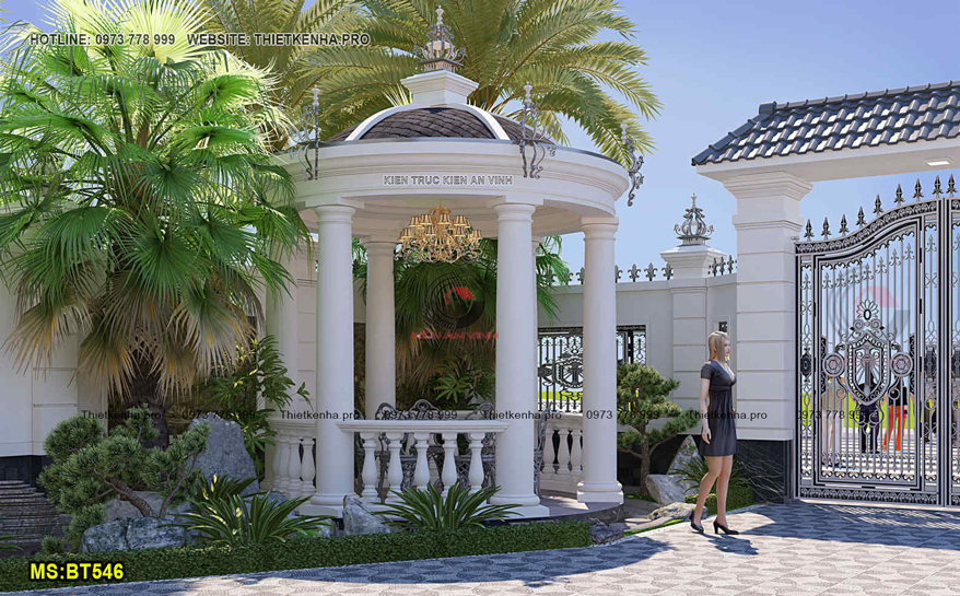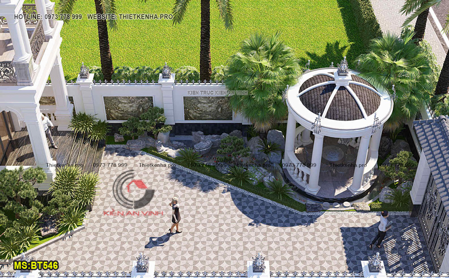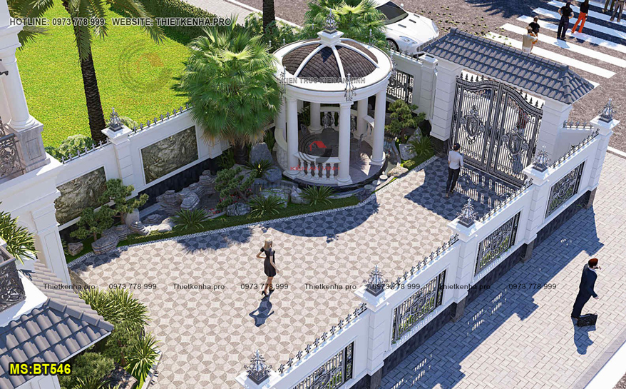 Biệt thự 2 tầng còn phát huy tối đa diện tích trống. Bằng cách bố trí sân vườn với các tiểu cảnh được bày trí xung quanh. Ngoài ra để có nơi thư giản, các thành viên có thể tụ tập sau mỗi ngày làm việc. Kiến trúc sư đã bố trí khu vực chòi ngay trong khuôn viên vườn. Tạo không gian thư giản thoải mái và thoáng mát.