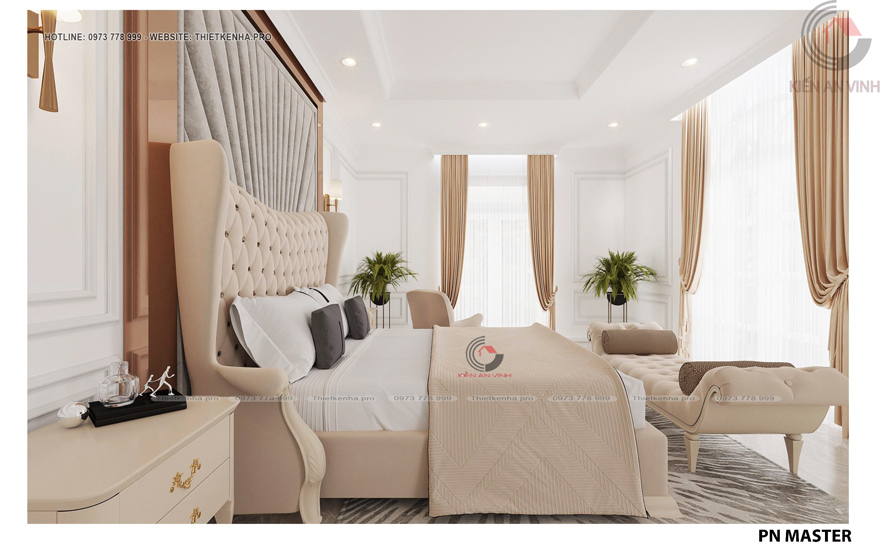 Ở khu vực tầng 2 của biệt thự 2 tầng tân cổ điển này có thể thấy, nét đặt trưng cũng là điểm nhấn của kiến trúc. Chính là việc thiết kế cửa ở khu vực này đều mang kiểu vòm và được làm bởi kính cường lực. Có khả năng ngăn tiếng ồn, tạo cảm giác riêng tư tách biệt cho 2 không gian bên trong và bên ngoài.